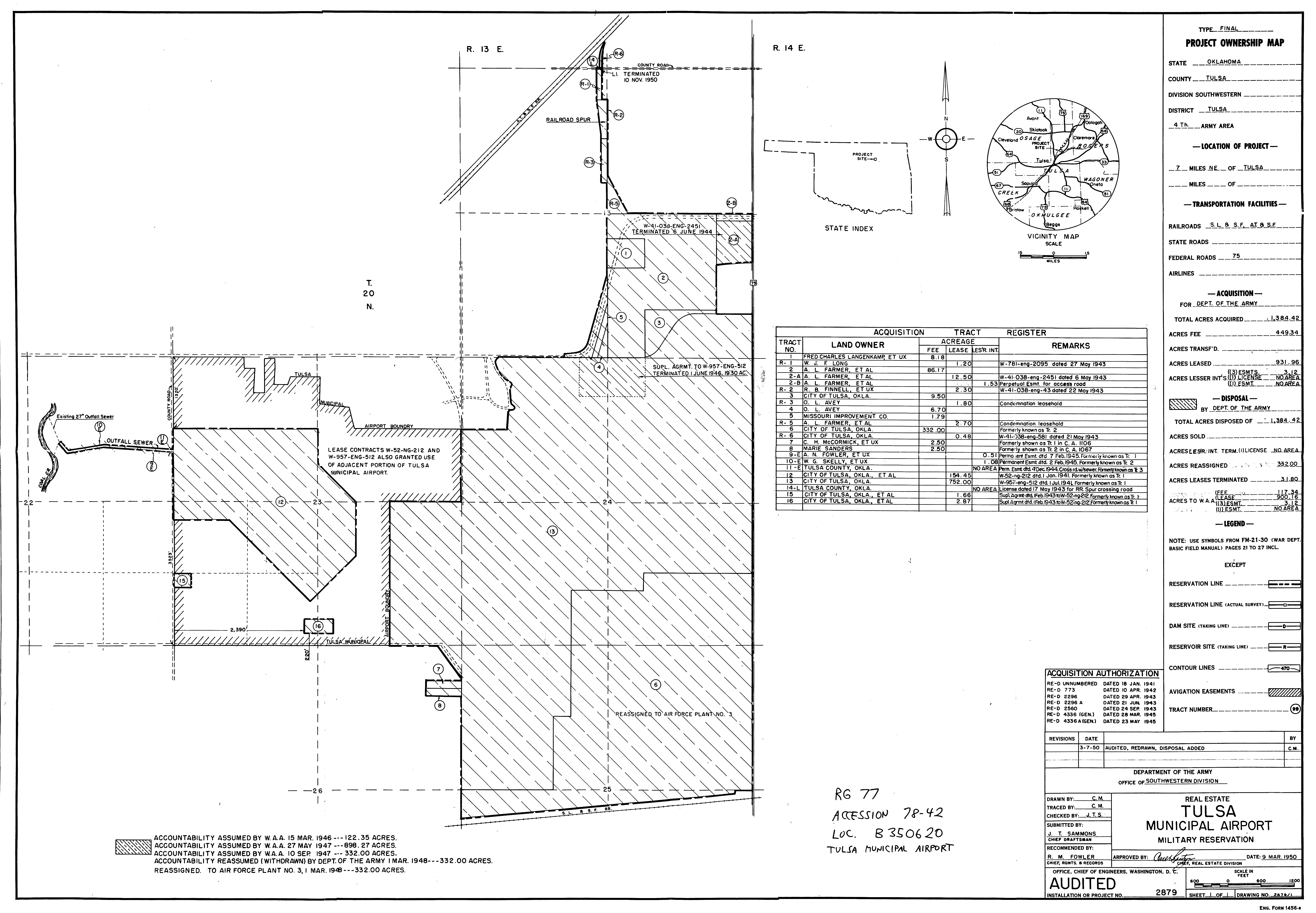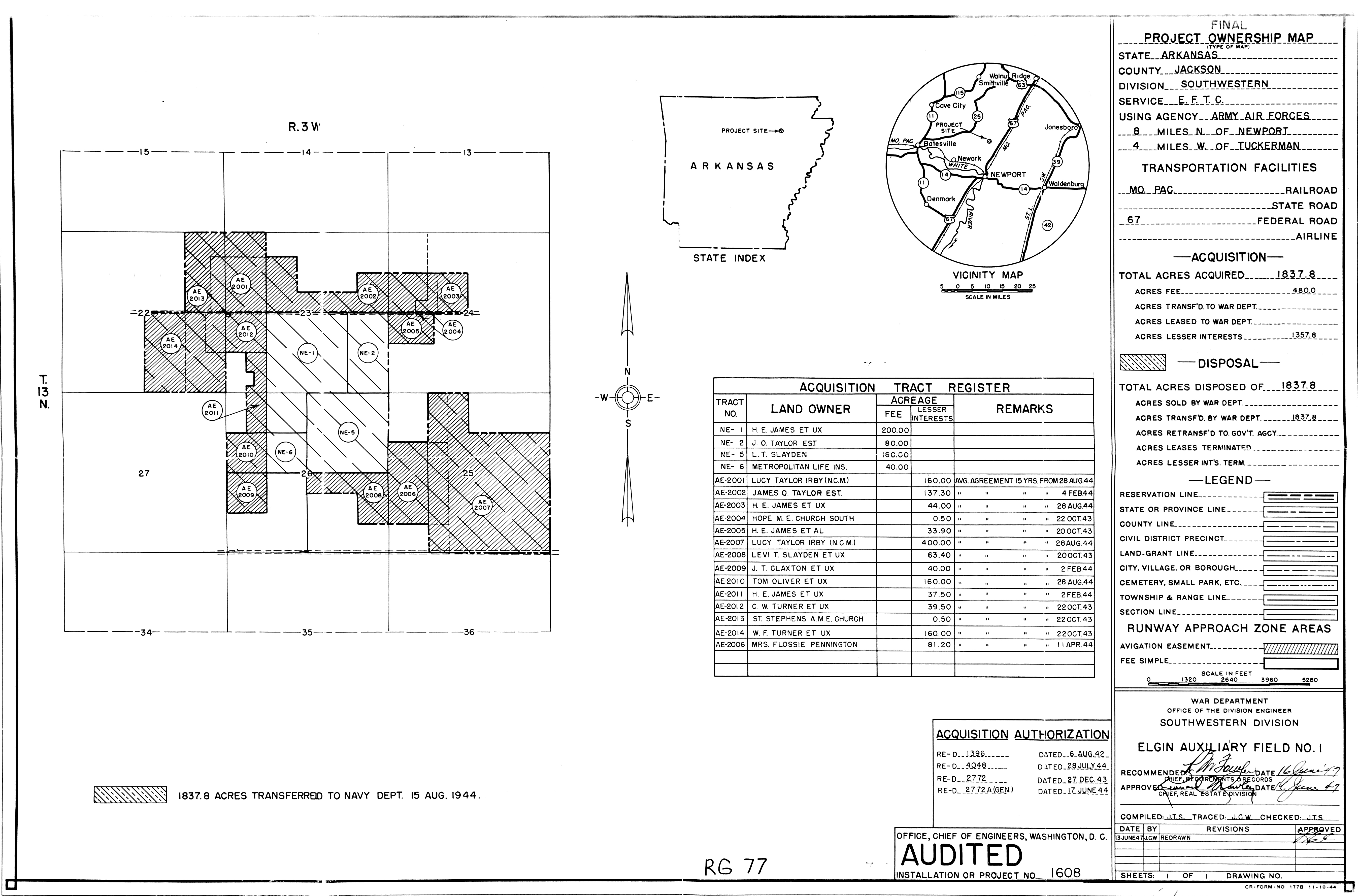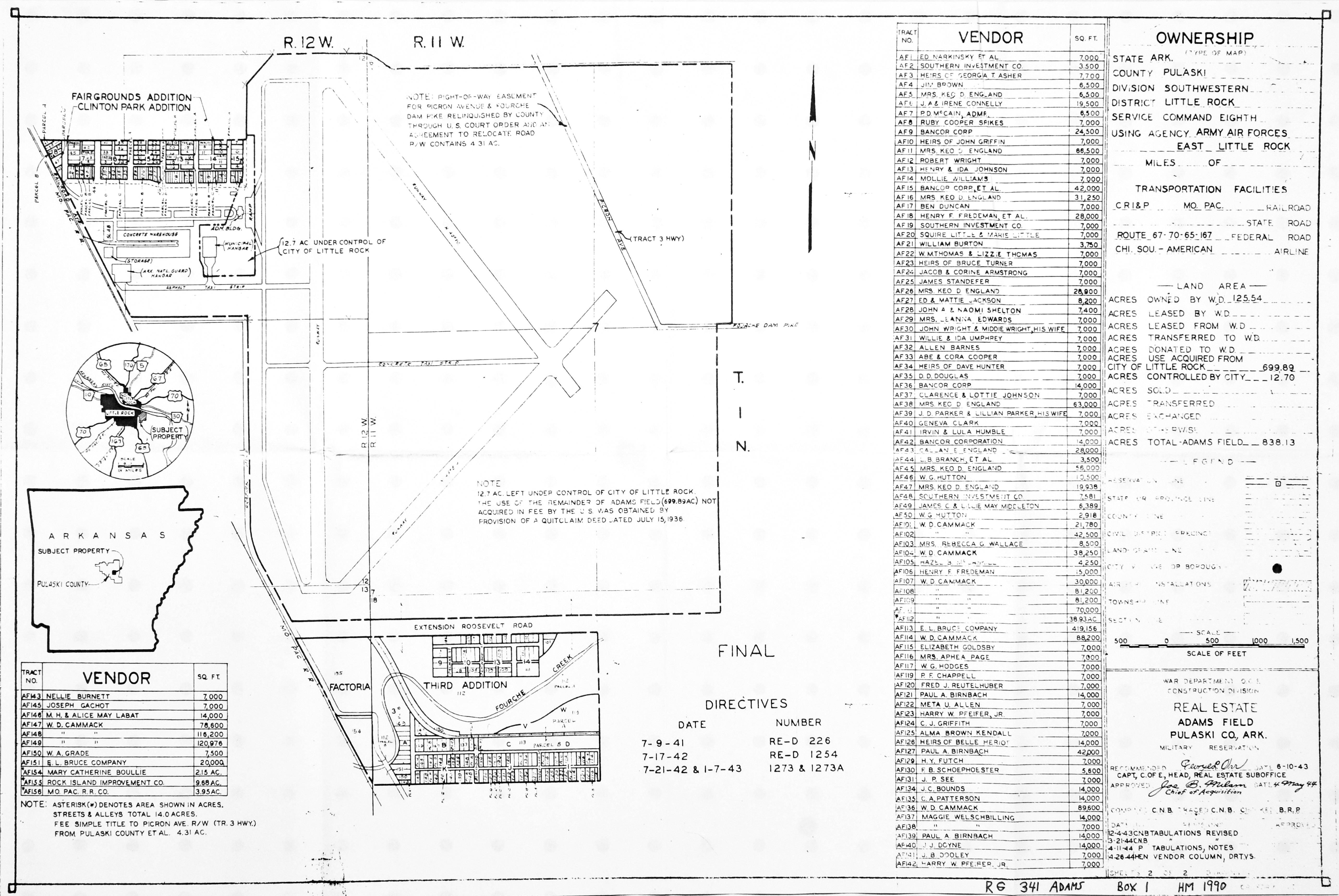 839 AAF Special Depot AR, 12th Ferrying Service Station, 19451002. NARA-SW. Adams Field AR, Real Estate, 19440504. NARA-SW. Air Force Plant No. 3 OK, Tulsa Aircraft Assembly Plant, 19440628. NARA-SW.