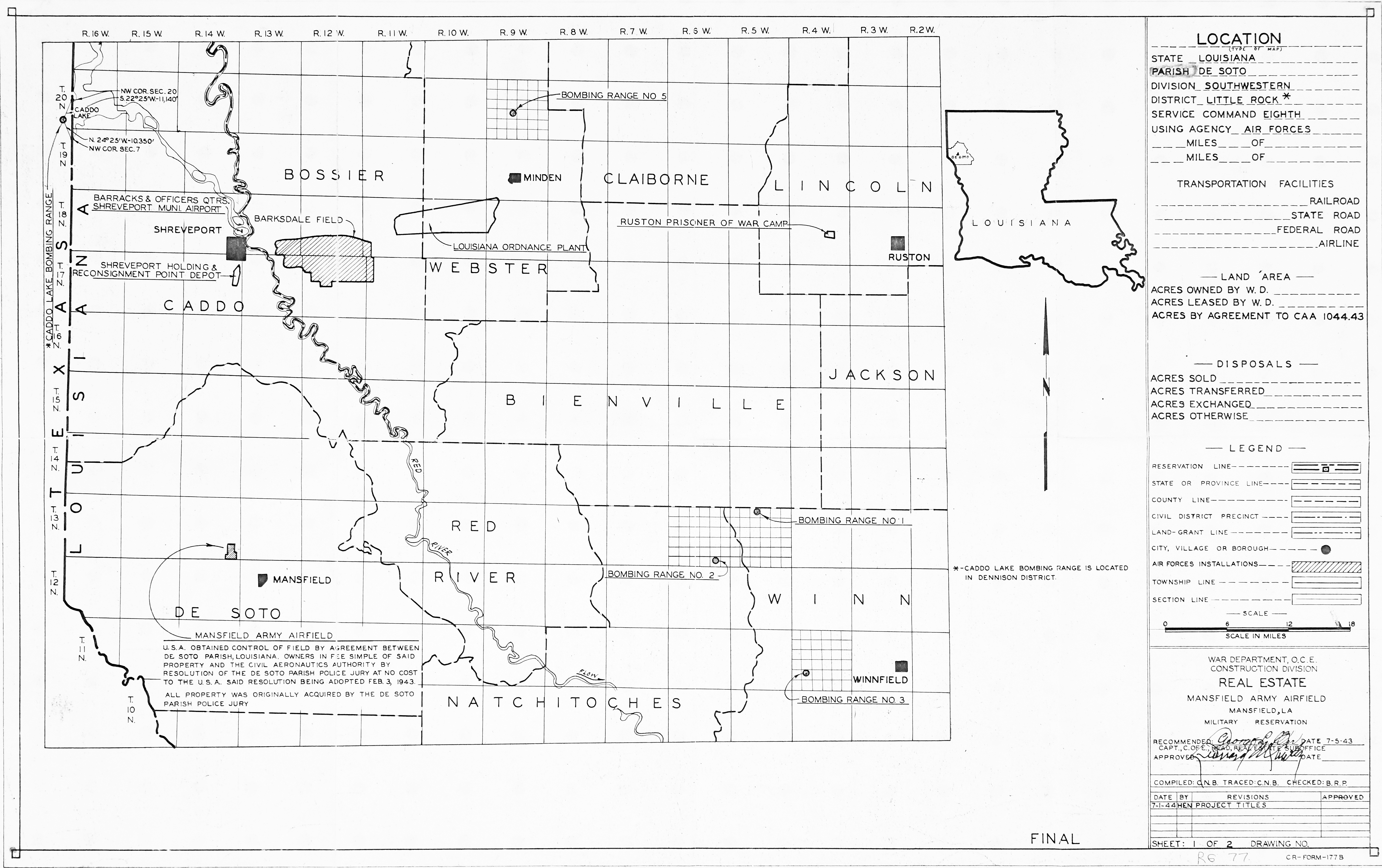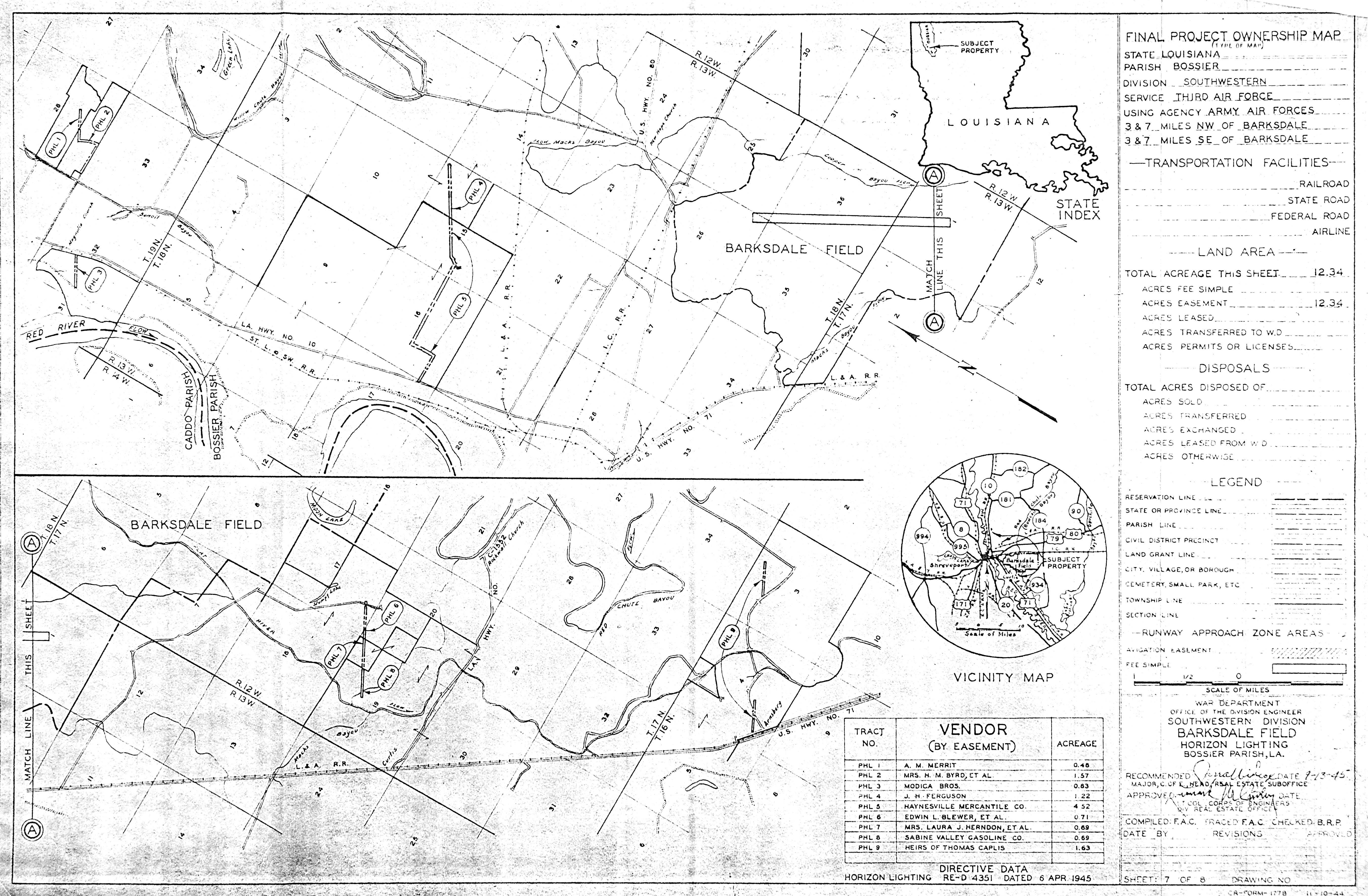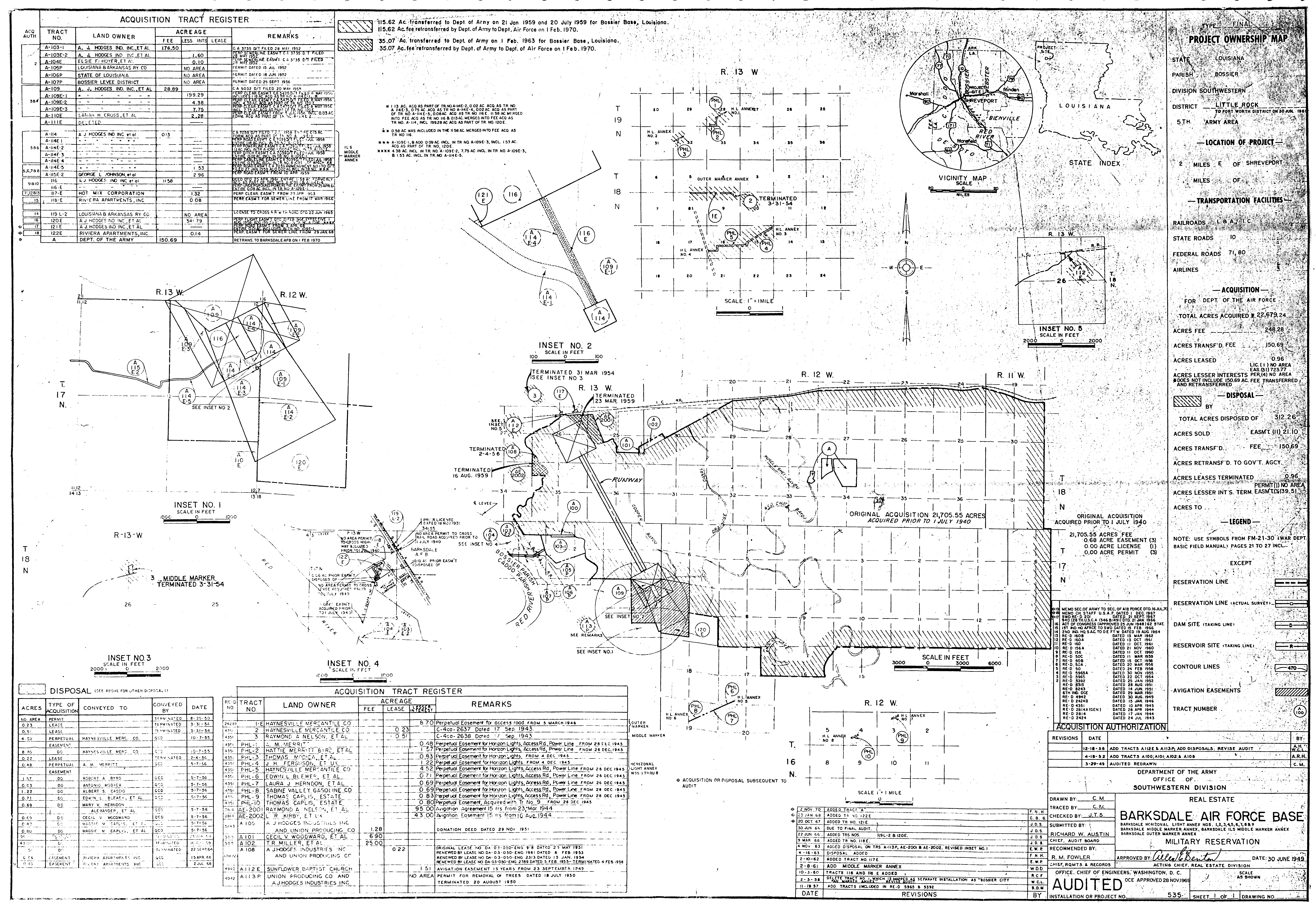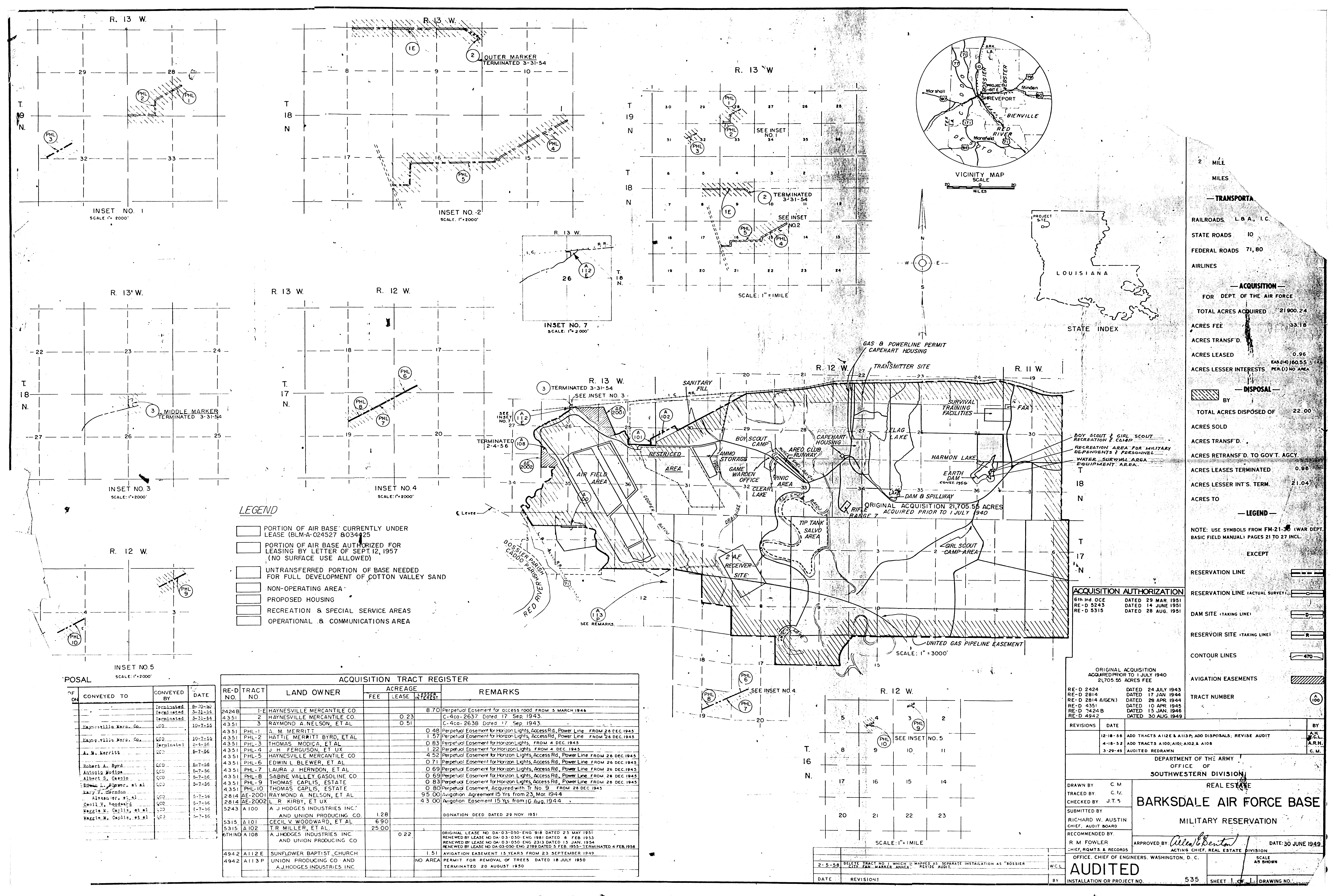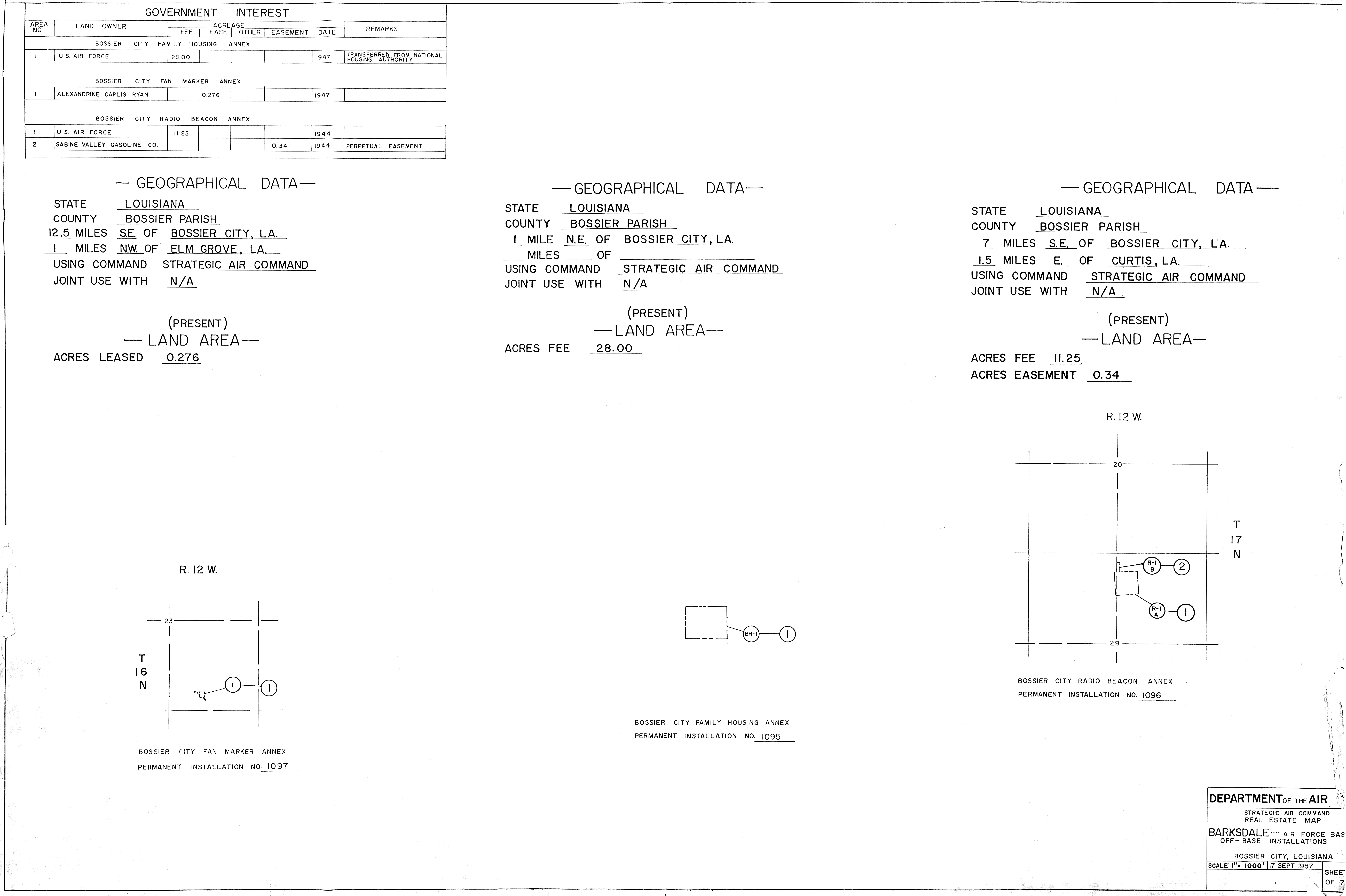 Barksdale AFB LA, Off-Base Installations, 19570917. FOIA. Barksdale Comms Annex TX, Real Estate, 19770630 [Traced]. FOIA. Barksdale Family Housing Annex LA, Ownership Map, 19580128. FOIA. Barksdale Fan Marker Annex LA, Real Estate, 19580205. FOIA. Barksdale Horizon Light LA, Ownership Map, 19450913. FOIA. Barksdale ILS OM Annex LA, Ownership Map, 19460204. FOIA. Barksdale Radio Beacon Annex LA, Real Estate, 19440317. FOIA.