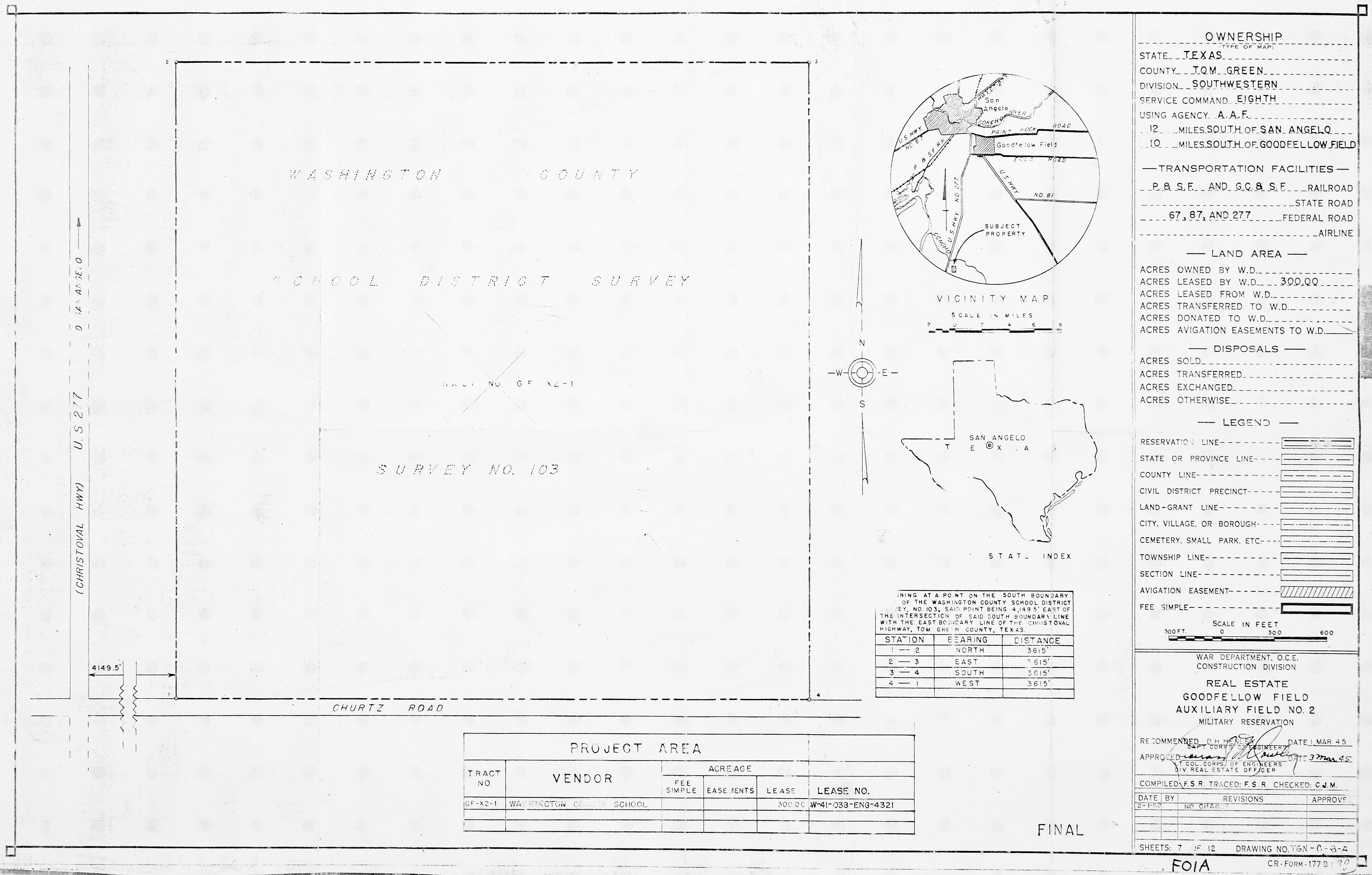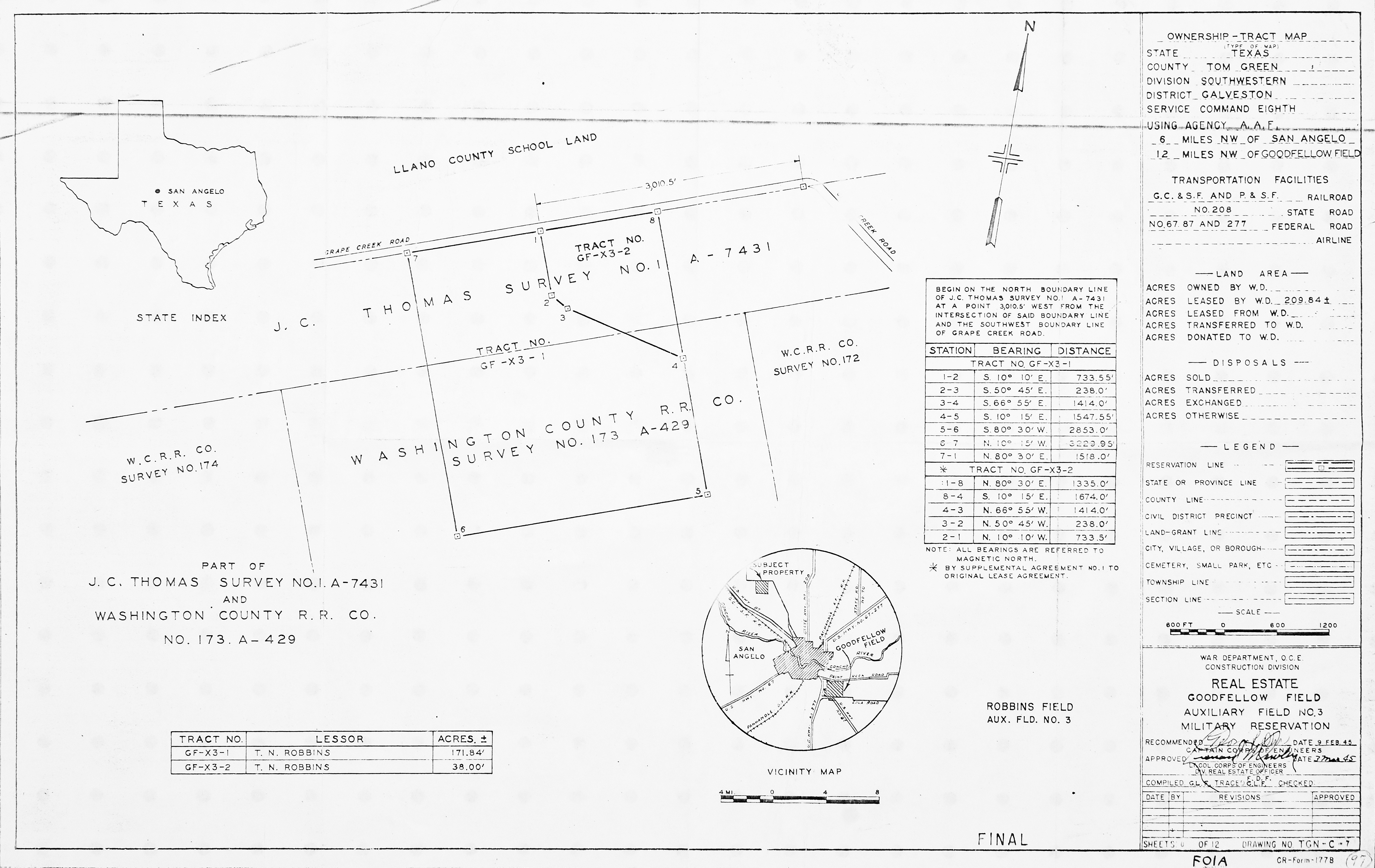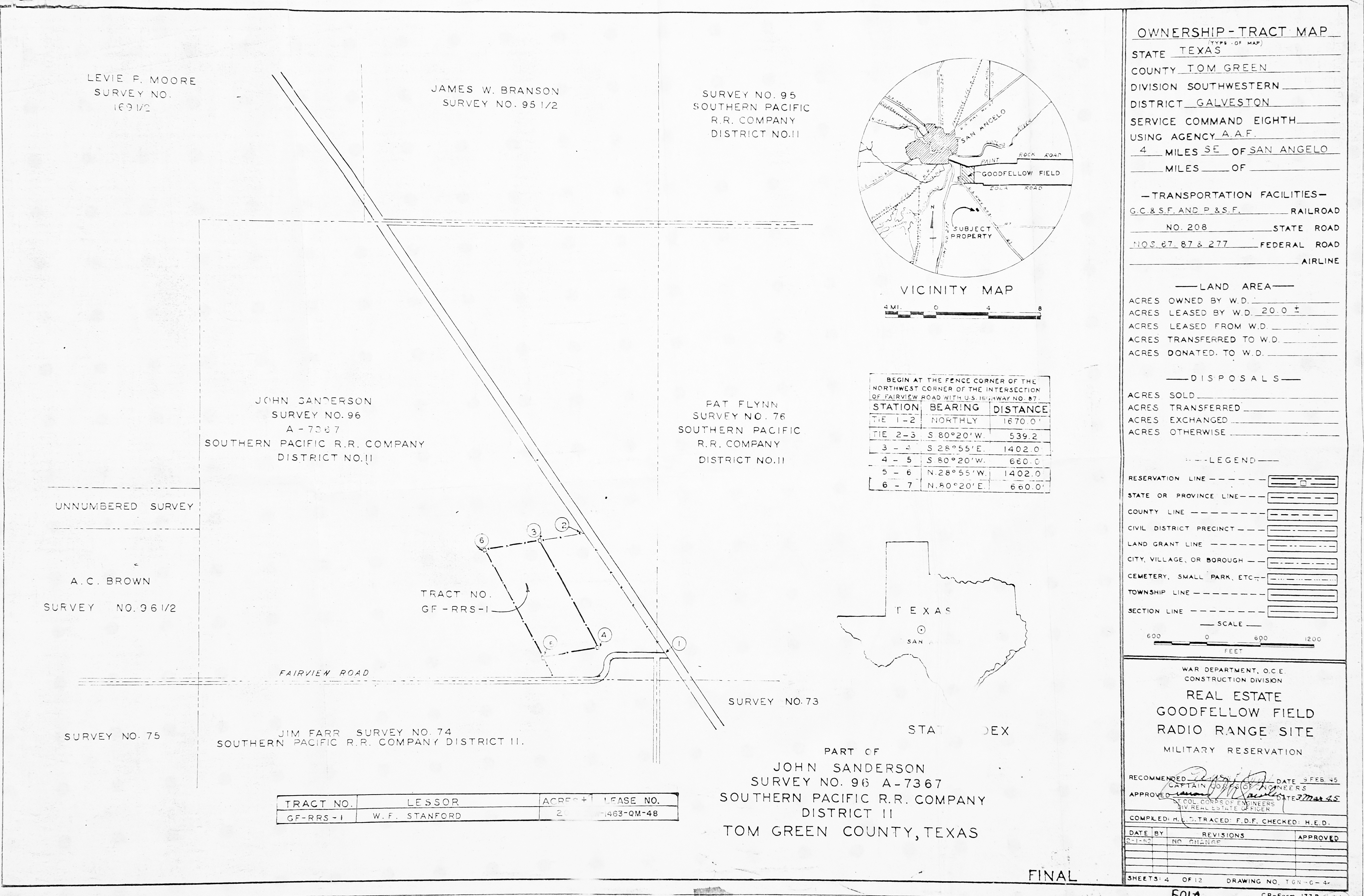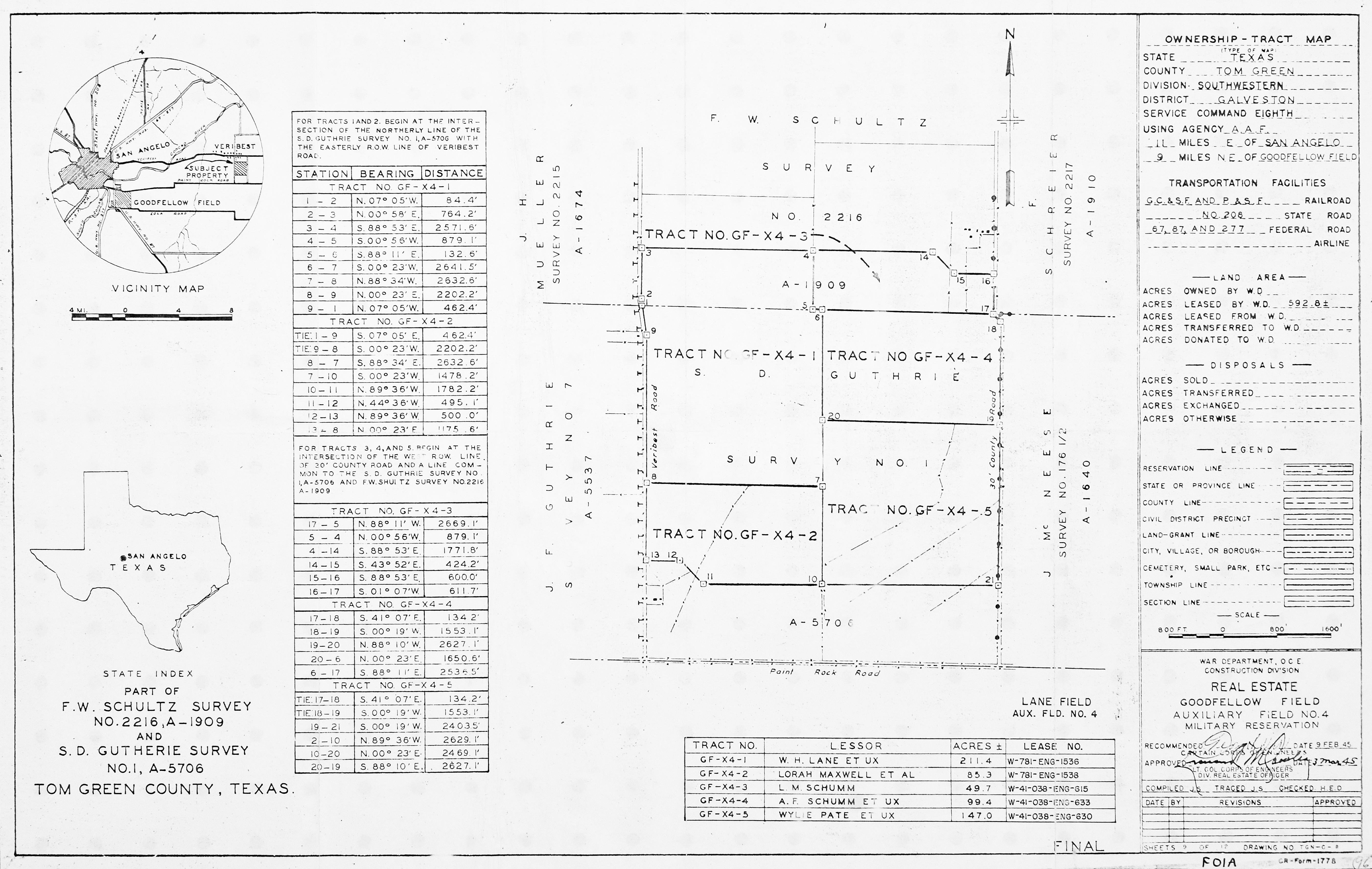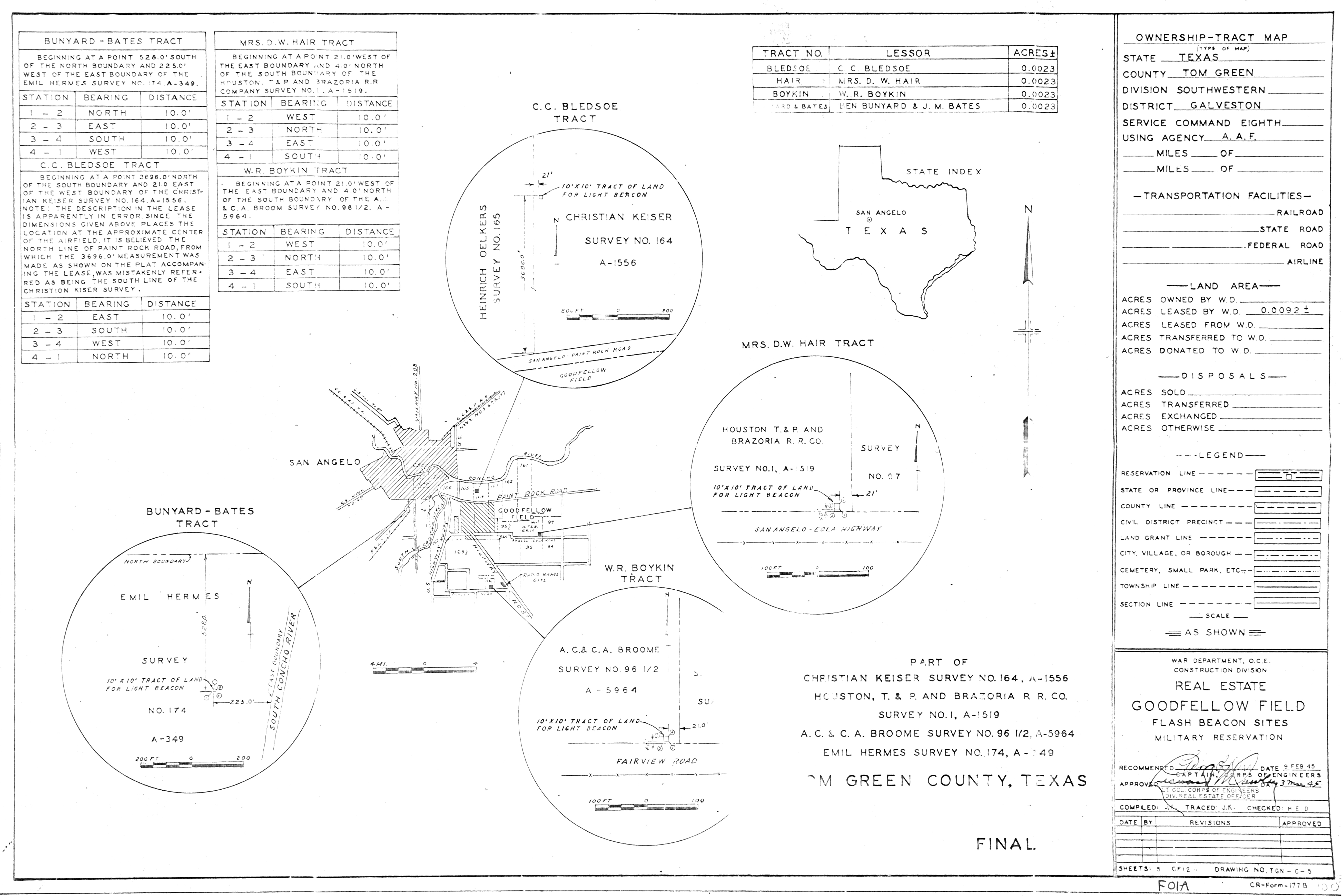 Goodfellow AFB TX, Roads Sidewalks Parking, 196501. FOIA. Added February 2026 Goodfellow Aux FLd 3 TX, Real Estate, 19450303. FOIA. Added February 2026 Goodfellow Light Beacons TX, Real Estate, 19450209. FOIA. Added February 2026 Goodfellow Radio Range TX, Real Estate, 19520201. FOIA. Added February 2026