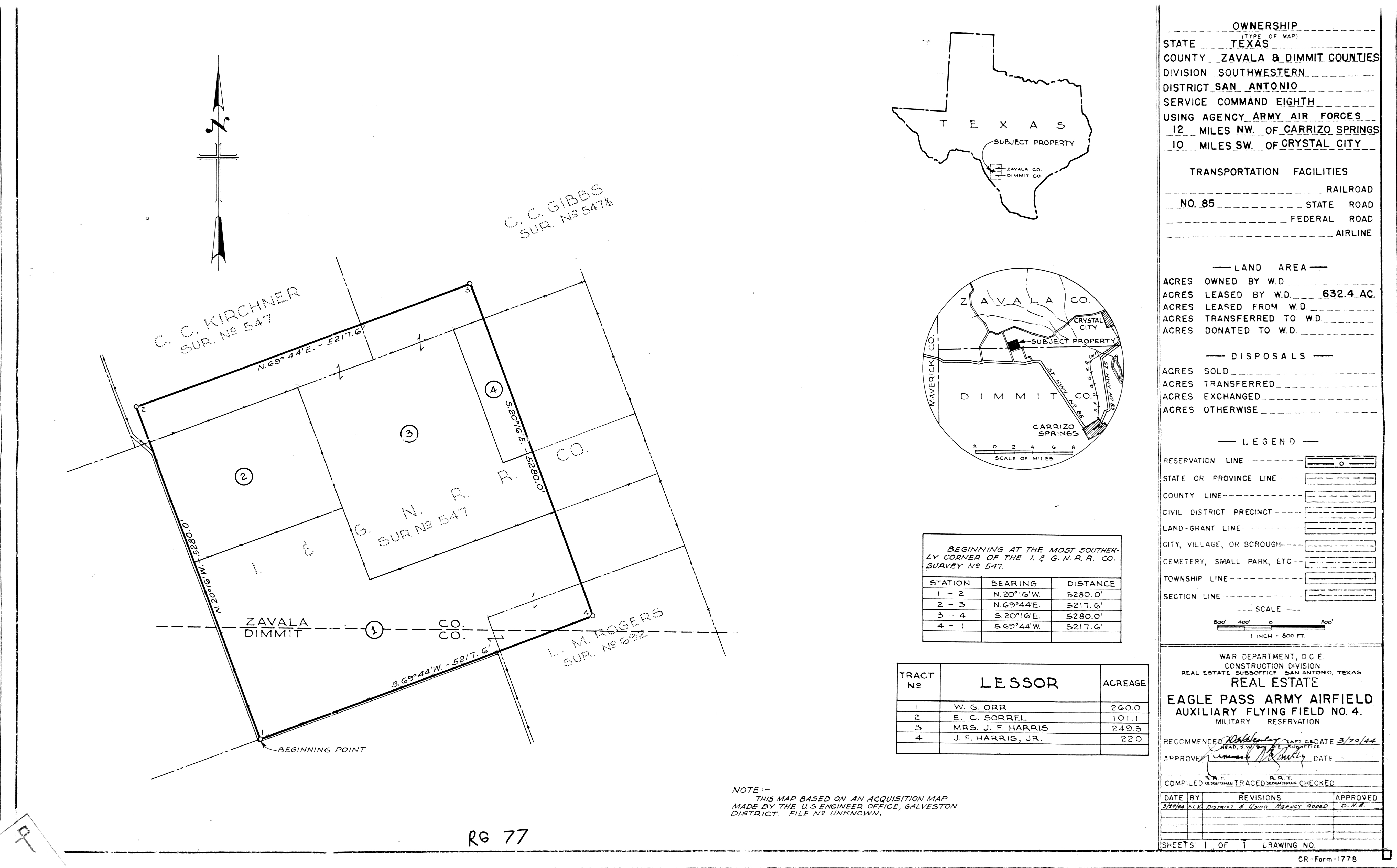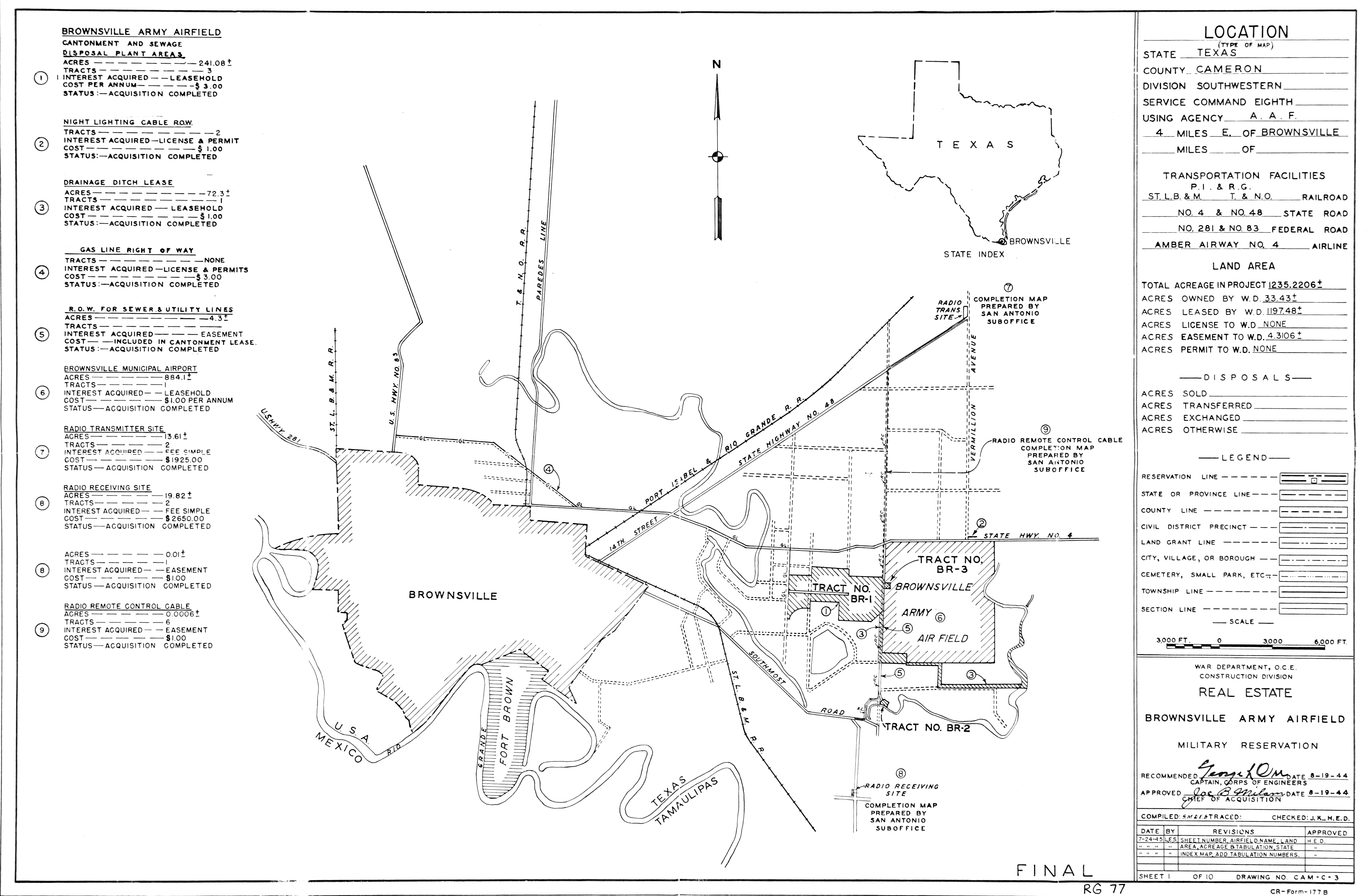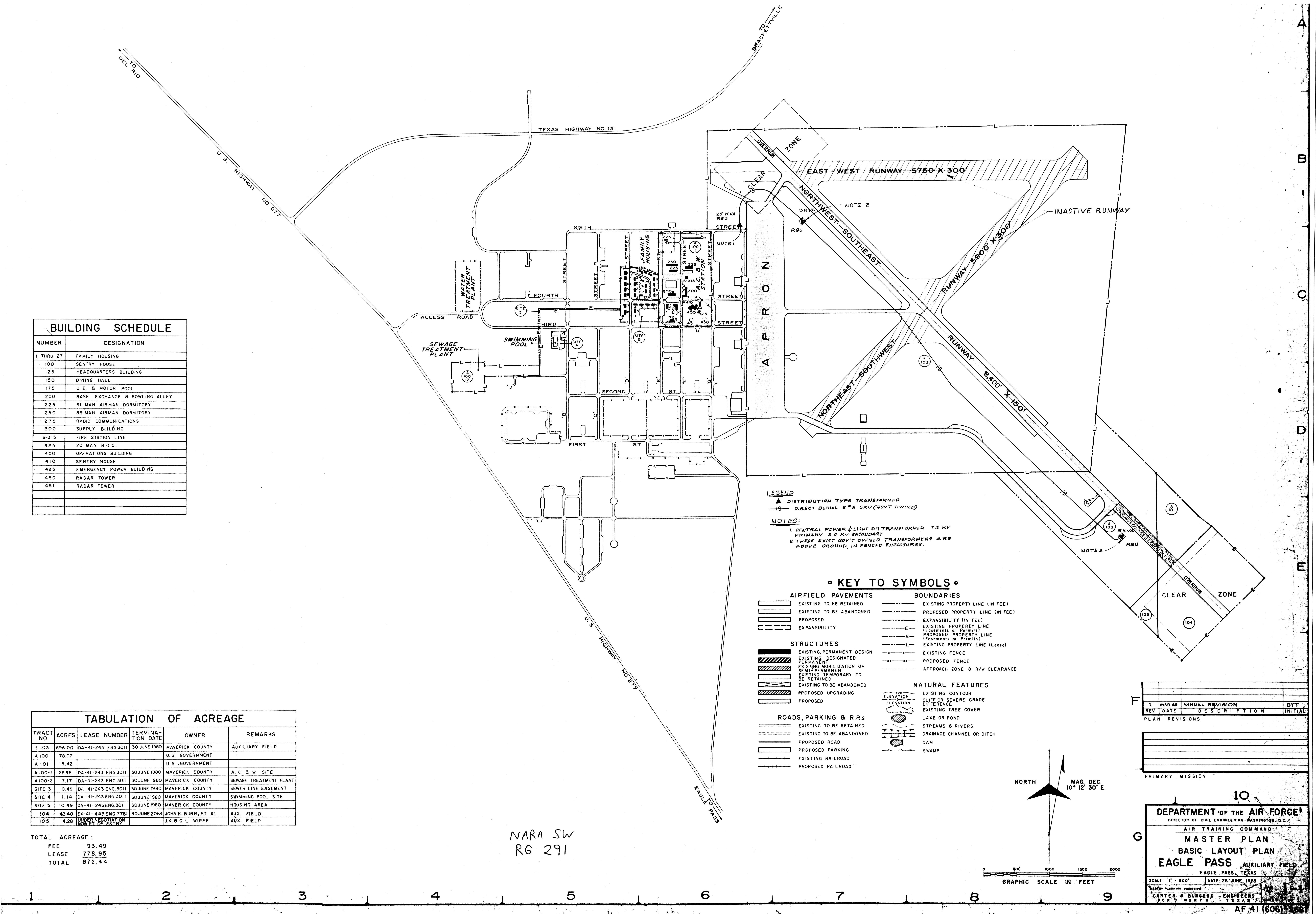 Camp Barkeley TX, Segments C, D, and E, 19440420. NARA-SW. Added February 2026 Eagle Pass AAFld TX, Basic Layout, 196503. NARA-SW. Eagle Pass Aux Fld 4 TX, Real Estate, 19440320. NARA-SW. Edinburg Aux Fld TX, Real Estate, 19470723. NARA-SW. Edward Gary Rad Rg Anx TX, Electrical Distribution, 19490210. NARA-SW.