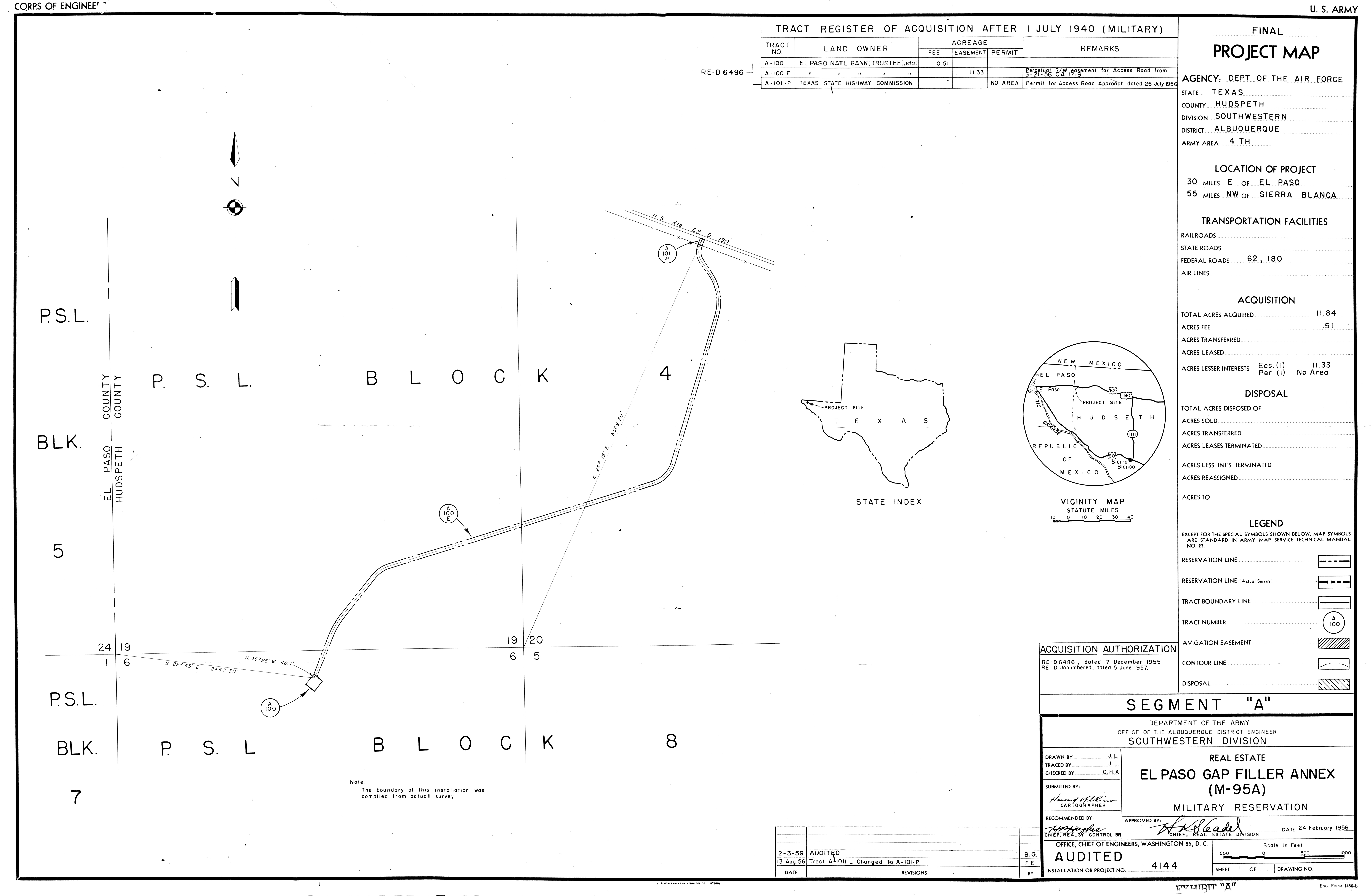 Edward Gary Rad Rg Anx TX, Real Estate, 19571004. NARA-SW. El Paso GFA TX, Real Estate, 19590203. NARA-SW. Elgin Aux Fld AR, Ownership Map, 19470616. NARA-SW. Ellington Field Gunnery Rg TX, Real Estate, 19460201. NARA-SW. Ellington Rad Rg 2 TX, Real Estate, 19460201. NARA-SW. Ellsworth AFB SD, Base Plan 1-of-20, 19750101. FOIA.