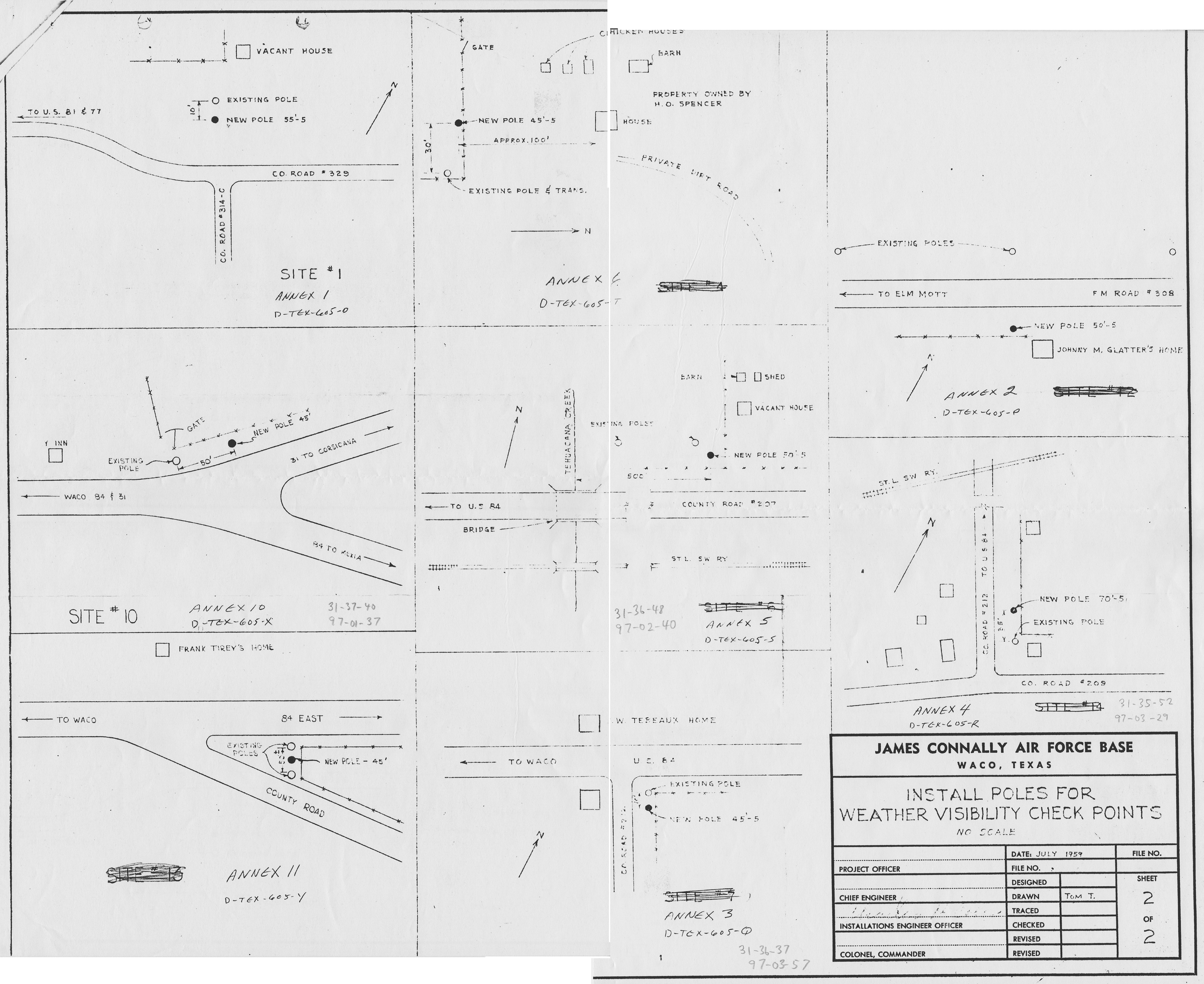 Hondo AB TX, Real Estate, 19450322. NARA-SW. Added February 2026 Hondo Housing Annex TX, Sewer and Water Systems, 19521124. NARA-SW. Added February 2026 Hondo Radio Range TX, Real Estate, nd. NARA-SW. Added February 2026 Hoskins Mound Bombing Range TX, Real Estate, 19460201. NARA-SW. Added February 2026 Howard Hughes Airport TX, Ownership Map, 19460201. NARA-SW. Added February 2026 Interior Radar Bomb Scoring Site SD, Hurley Butte RBS, 19670214. FOIA. James Connally AFB TX, Annexes, 19650831. NARA-SW. James Connally ILS OM Anx TX, Real Estate, 19590302 Added February 2026 James Connally Light Annexes TX, Install Poles, 195907. NARA-SW. Added February 2026 Johnston Atoll AFB UMI, Base Plan, 19770426. FOIA. Added February 2026