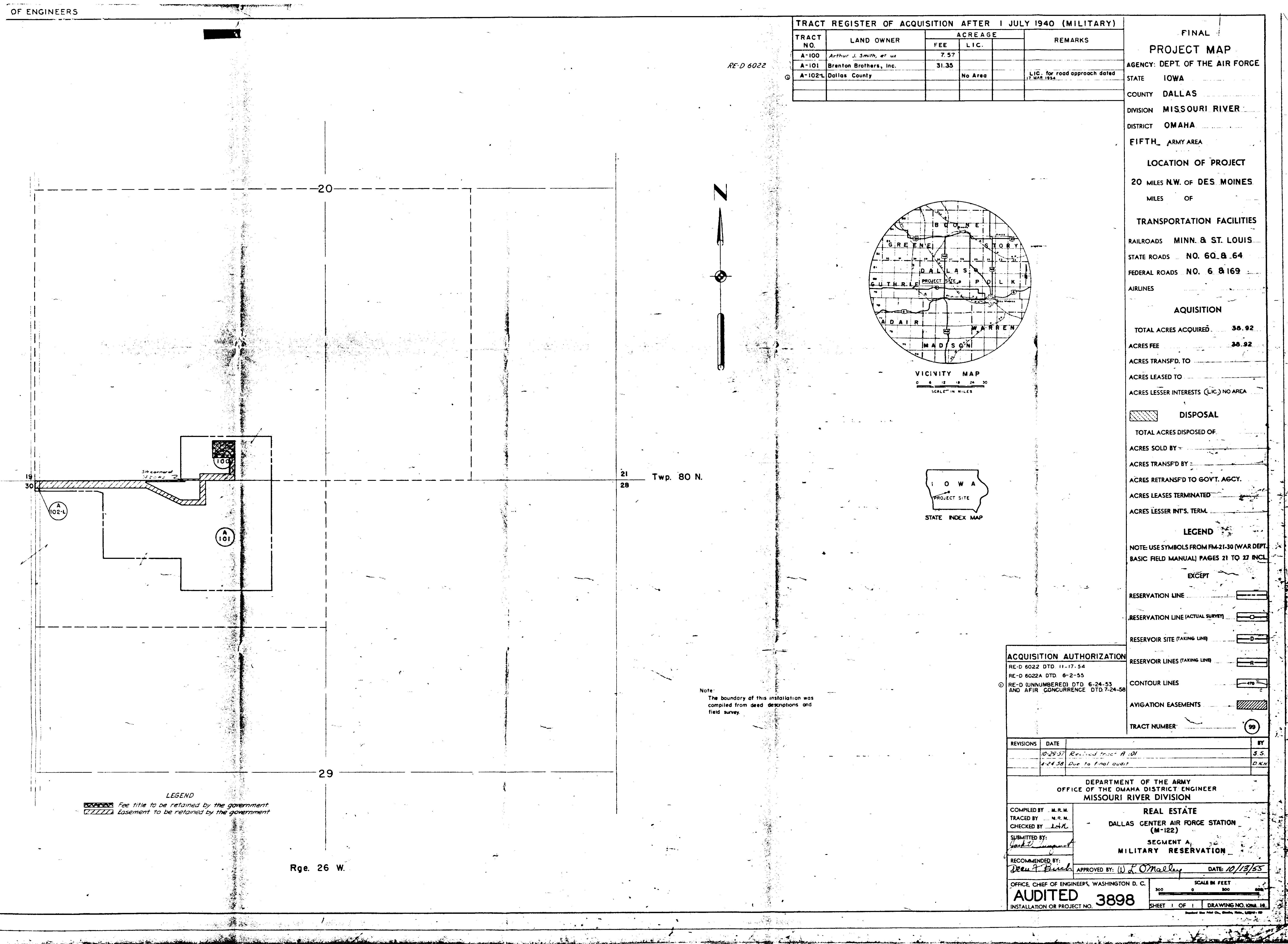 Dallas Center AFS IA, Water-Sewer Layout Plan, 19551101. CoE. Added February 2026 Davidson Aux Fld OK, Ownership Map, 19470501. NARA-SW. Added February 2026 Delhi GFA LA, Real Estate 1, 19570611. NARA-SW. Added February 2026