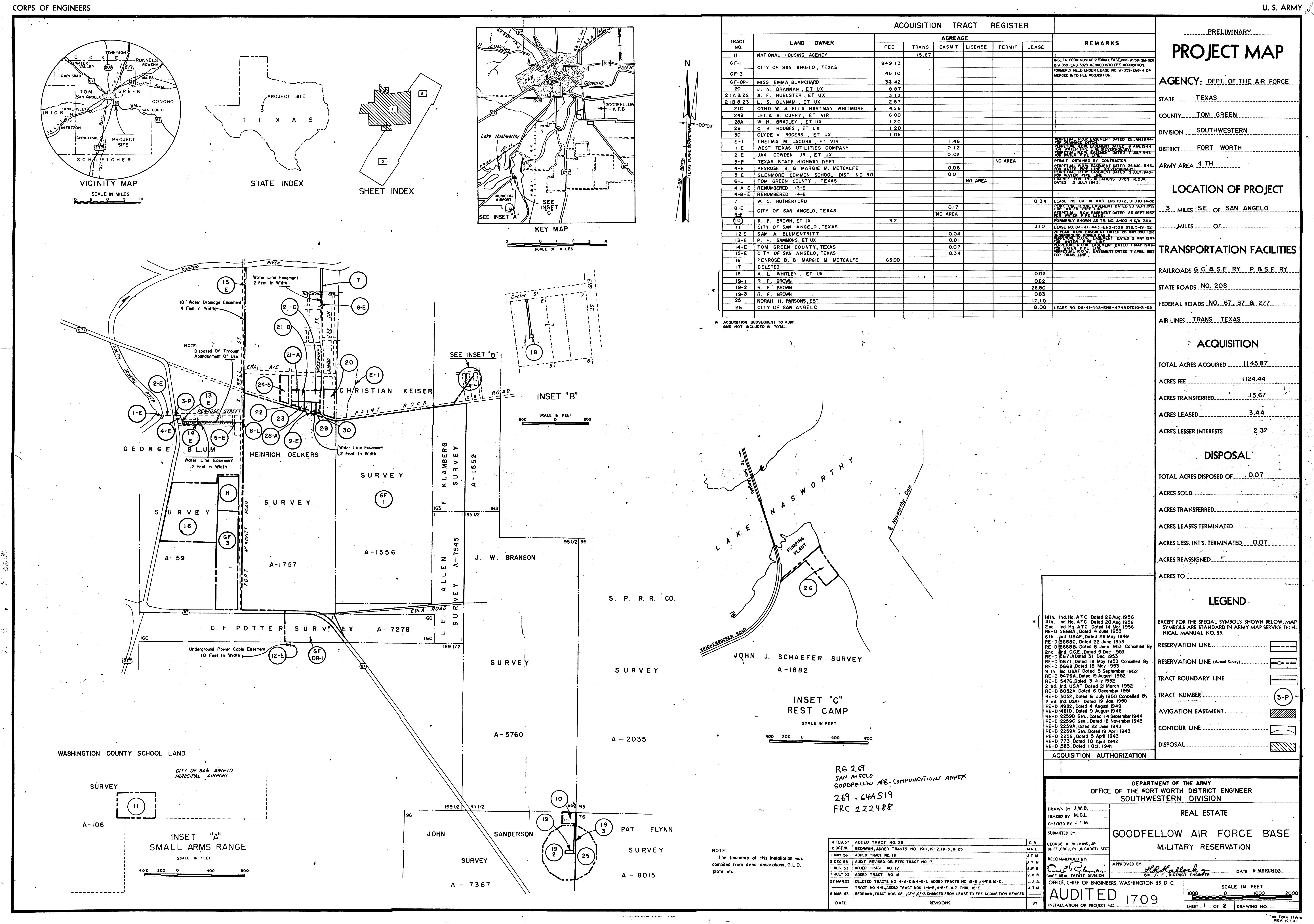 Goodfellow AFB TX, Roads Sidewalks Parking, 196501. FOIA. Added February 2026 Goodfellow Aux FLd 3 TX, Real Estate, 19450303. FOIA. Added February 2026 Goodfellow Light Beacons TX, Real Estate, 19450209. FOIA. Added February 2026 Goodfellow Radio Range TX, Real Estate, 19520201. FOIA. Added February 2026